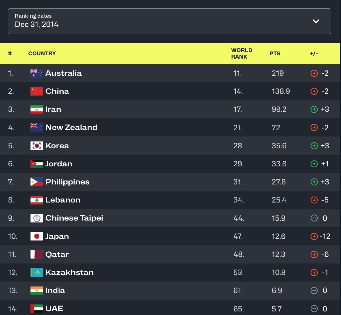 和2014年12月31号的榜单相比,亚洲主要国家男篮的变化如下: