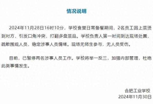 11月30日,合肥工业学校发布情况说明:2024年11月28日16时10分,学校食堂日常备餐期间,2名员工因上菜烫到对方,引发口角冲突,打翻多盘菜品。学校负责人第一时间到达现场处置,疏散围观人员,稳定涉事人员情绪。现场无师生参与,无人员受伤。