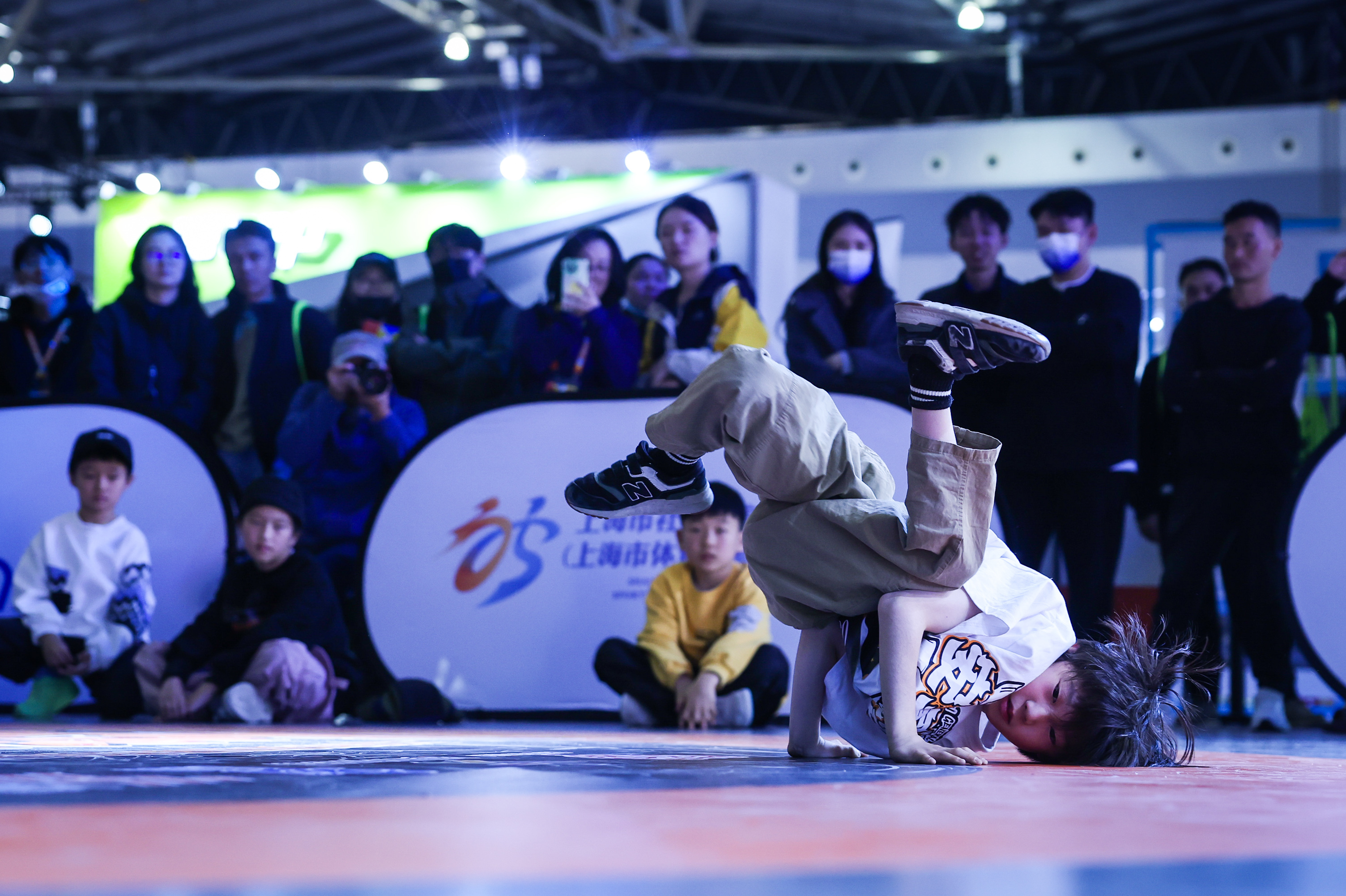 在热闹的上海市体博会现场,霹雳宝贝们的身影吸引了不少市民驻足观赛。11月29日,上海市第四届市民运动会体育舞蹈项目总决赛上海市第五届街舞(霹雳舞)锦标赛在世博展览馆举行,来自全市15个区的共70名选手参赛。