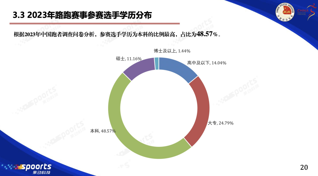 哪怕从学历和工作上看,马拉松也是一项中产的运动。2023年,本科及以上学历的跑者占比百分之六十以上。机关事业单位工作人员和企业管理者加起来也占百分之三十左右,和企业职员的人数相当。