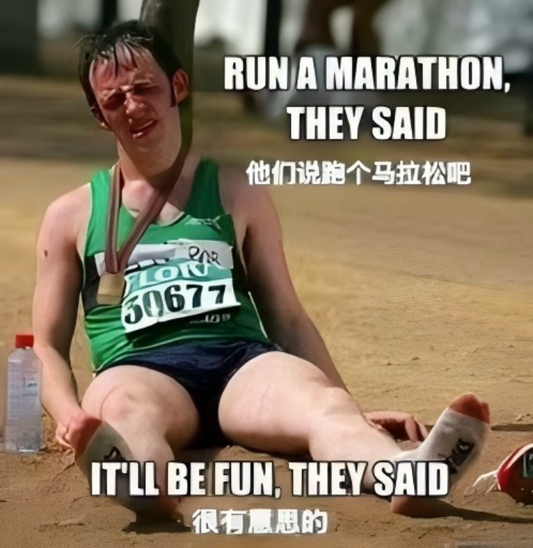 因此,有人调侃现在的马拉松,就是二十多岁的年轻人当志愿者端茶送水,服务赛场上身体矫健的四五十岁的中年人。被中年人拉爆的年轻人也不用气馁,只要说一句话就可以让赛场上如风一样的中年男人破防: