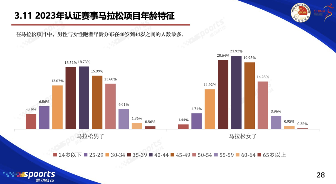 厦门马拉松并非个例。中国田径协会主编的《2023中国路跑赛事蓝皮书》显示,在马拉松项目中,男性与女性跑者年龄分布在40岁到44岁之间的人数最多。男子平均成绩最好的为40-44岁的跑者,女子平均成绩最好的为35-39岁的跑者。