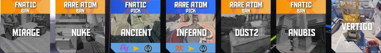 地图选择:FNC禁Mirage,RA禁Nuke,FNC选Ancient(RA选CT开),RA选Infeno(FNC选CT开),RA禁Dust2,FNC禁Anubis,图三Vertigo。