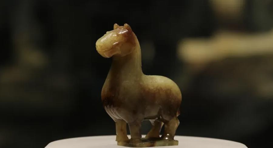 这是一匹出生于战国时期的黄色“小玉马”,身高仅有5.7公分,圆润剔透,双耳高挺,双目有神,嘴角微向上扬起,简约流畅的线条勾勒出小马昂扬的姿态,连皮毛的色泽和纹理都通过一种名为“俏色”工艺呈现了出来。