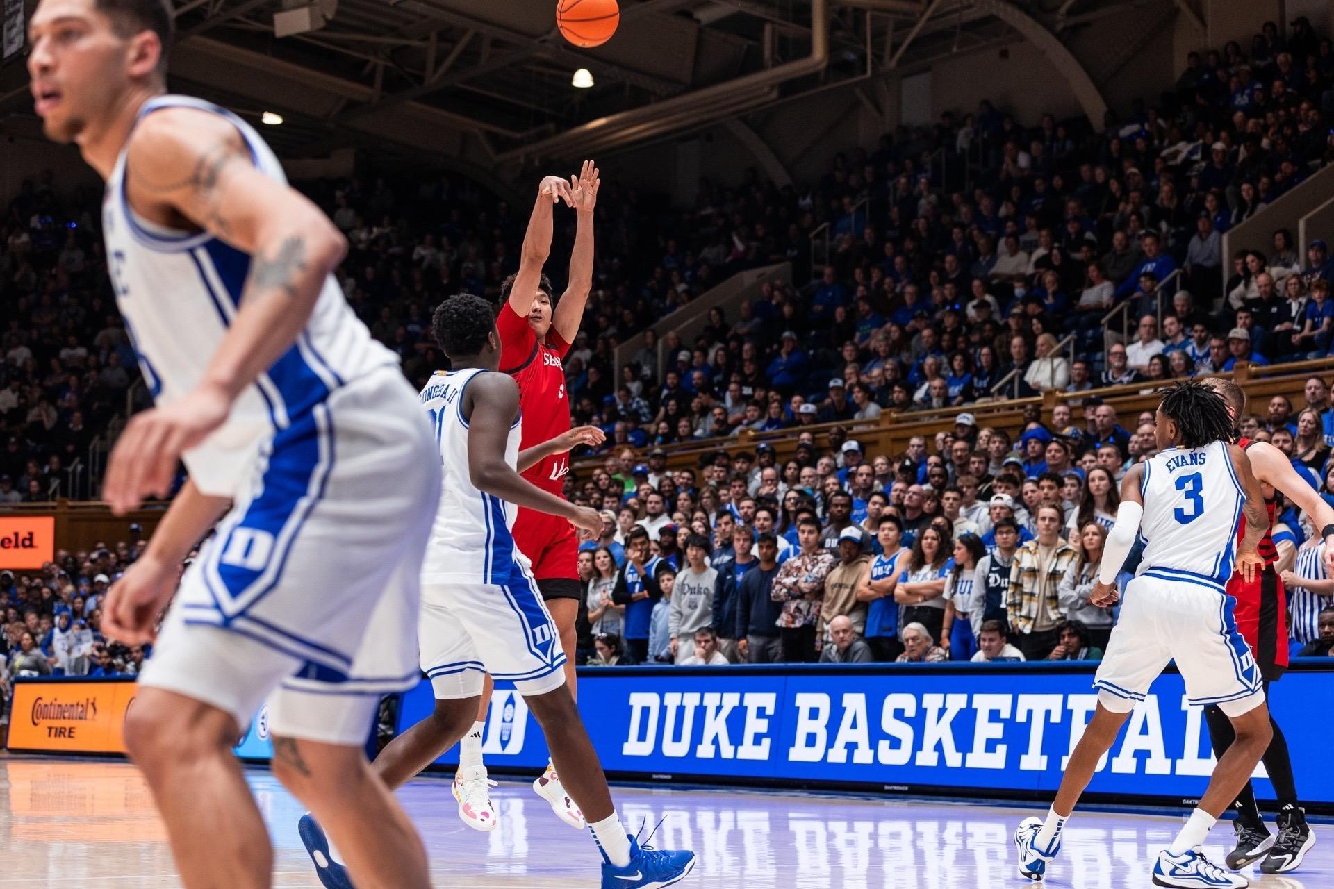 淡厚然晒出了本场比赛的照片,并配文写道:“很有幸能与杜克这样强大的球队交手,能与未来的NBA状元秀对位,放在五年前,这是我根本不敢想象的,但现在,我凭借我的努力,站到了这个舞台上。很感谢大家对我的认可与支持,同时我也会更加努力的向更高的平台发起冲击。”