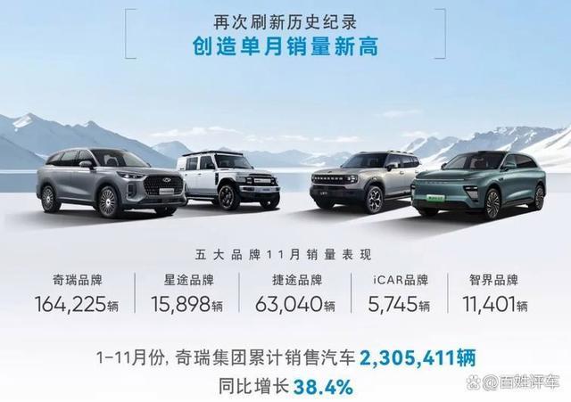 今年以来,奇瑞集团销量表现不断向上,在行业保持了四大领先:1-11月份,奇瑞集团累计销量2,305,411辆,同比增长38.4%,增速位居行业前列;海外出口1,046,186辆,同比增长22.4%,连续第22年位居中国汽车品牌出口第一;新能源汽车累计销售480,948辆,同比增长214%,新能源增速位居主流车企首位;SUV市占率稳居14%以上份额,保持行业第一。