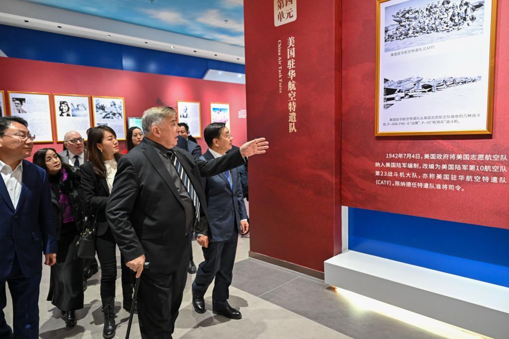11月30日,美中航空遗产基金会代表团成员在乌鲁木齐文化中心展览馆观看“铭记英雄——飞虎队主题历史图片展巡展(新疆)”。新华社记者 丁磊 摄