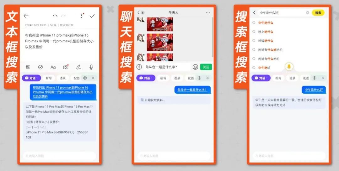 而且还可以在任何输入界面完成搜索,在聊天时搜,在创作时搜,甚至可以在点外卖时搜。