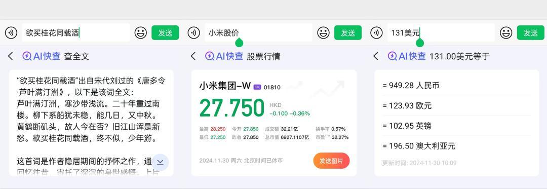 搜狗的关键词还能支持更多,搜诗句能找到这首诗,搜股价能显示价格,甚至输入外国货币金额,能显示兑换人民币的金额。