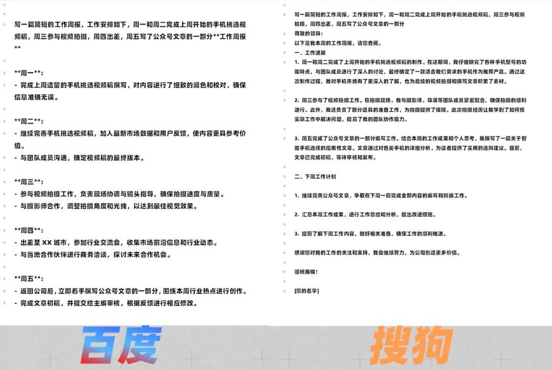 其中搜狗输入法无疑是最好的,有工作安排和进展,也有下周工作计划,百度的结果也有每天的工作内容,生成内容可能不准确,但可以调整。