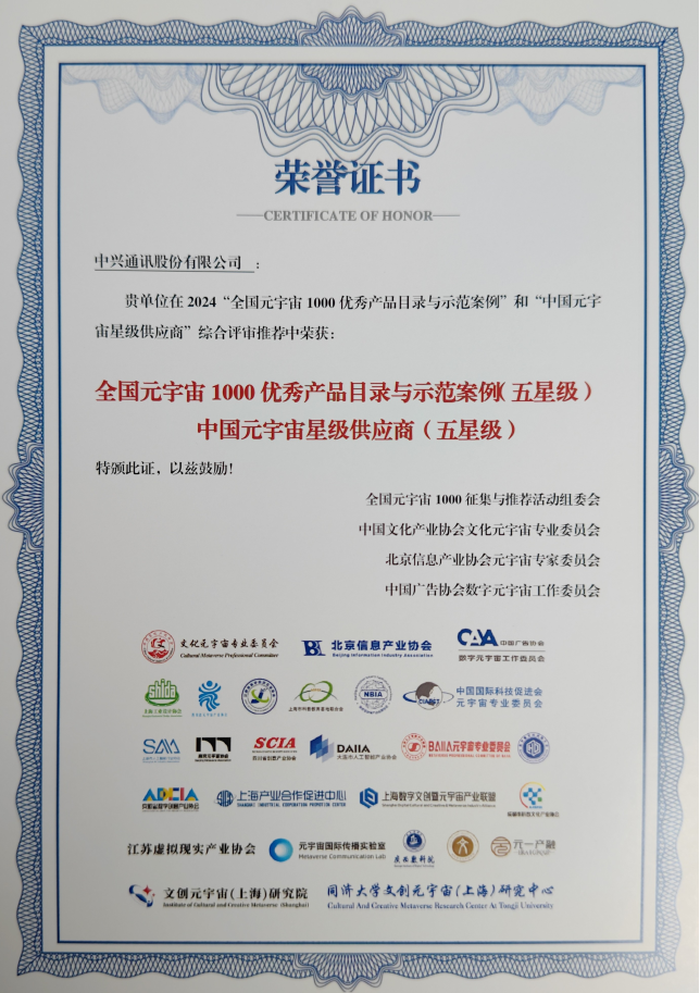 同期,根据国家工信部、文旅部等五部门联合印发的《元宇宙产业创新发展三年行动计划(2023—2025 年)》文件要求,中国文化产业协会、北京信息产业协会、中国广告协会联合编制并发布《全国元宇宙1000优秀产品目录与示范案例汇编》,通过一批具有创新性、示范性和引领性的优秀产品和案例,引领中国元宇宙产业繁荣发展。中兴通讯荣获中国元宇宙五星级供应商,同时中兴通讯数字星云核心引擎XRExplore及5G VR 大空间沉浸剧场应用成功入选五星级优秀产品和示范案例。