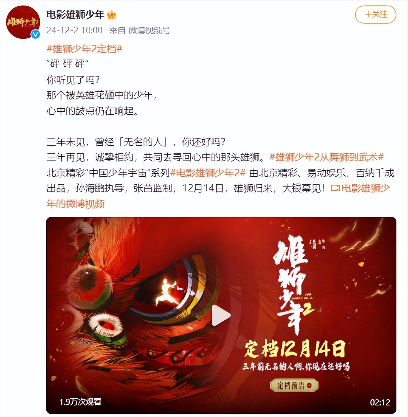 12月2日,电影《雄狮少年2》官宣定档12月14日。