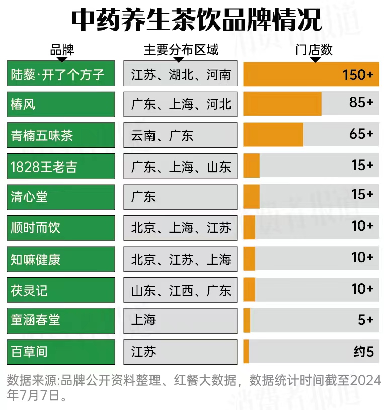 敏锐的商家迅速嗅到商机,推出了大量同类产品,包括来自糖水铺、面包店甚至医院药房的中药奶茶、药材冰淇淋;以及加了中药材或者传统的养生食材的中医药膳、中药茶饮等。这些产品在全国迅速走红。据餐饮行业第三方平台不完全统计,截至2024年7月,全国已有超30个主打中药或草本养生的茶饮品牌,如陆藜·开了个方子、青楠五味茶、椿风、知嘛健康、百草间等,部分品牌已在一线、二线城市开设了上百家门店。