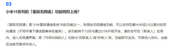 12月2日,小米澎湃OS官方发布《小米澎湃OS答网友问(第三集)》,回应小米15系列“星辰无网通”功能何时上线。