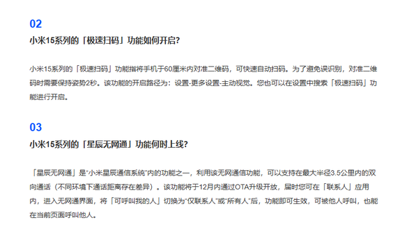 此外,小米公司还解答了小米15系列手机的“极速扫码”功能。该功能开启后,用户只需将手机对准二维码并保持姿势2秒,即可快速自动扫码,大大提升了扫码的便捷性。开启路径为“设置-更多设置-主动视觉”,用户也可直接在设置中搜索该功能进行开启。