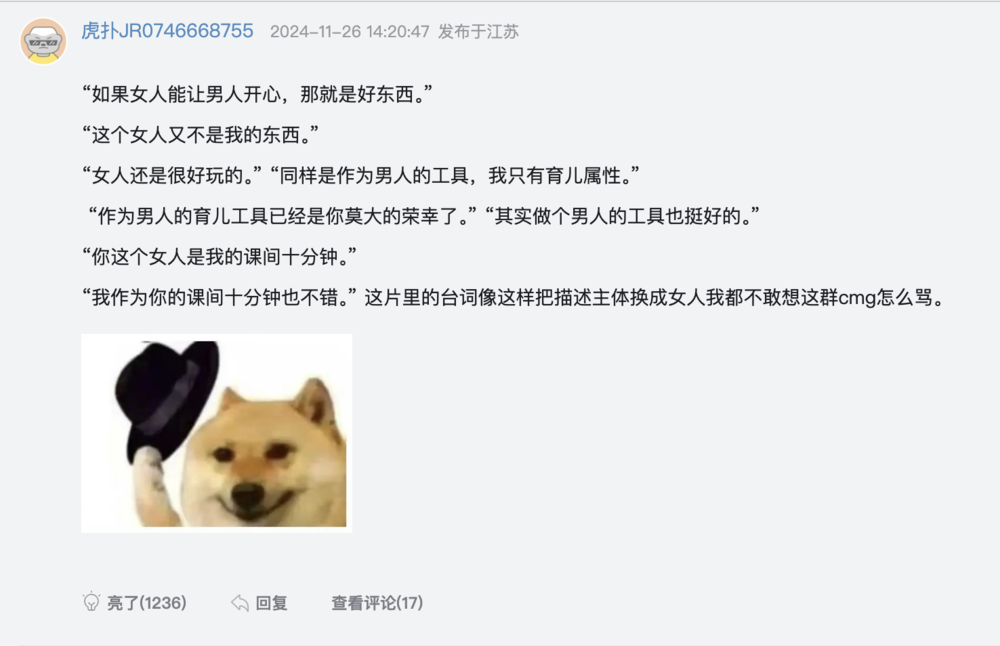 最常见的高赞评论,是把《好东西》的台词的性别互换一下,证明这个电影“终极辱男仇男”。