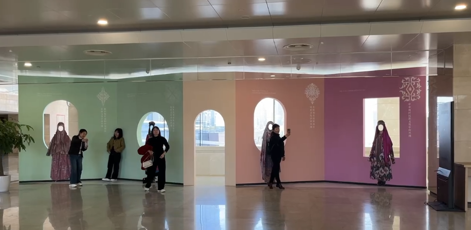 记者注意到,现场除了有欧亚各具民族特色的服饰之外,还有棉、麻、丝三类不同纺织物的科普展柜和趣味丝绸打卡装置。