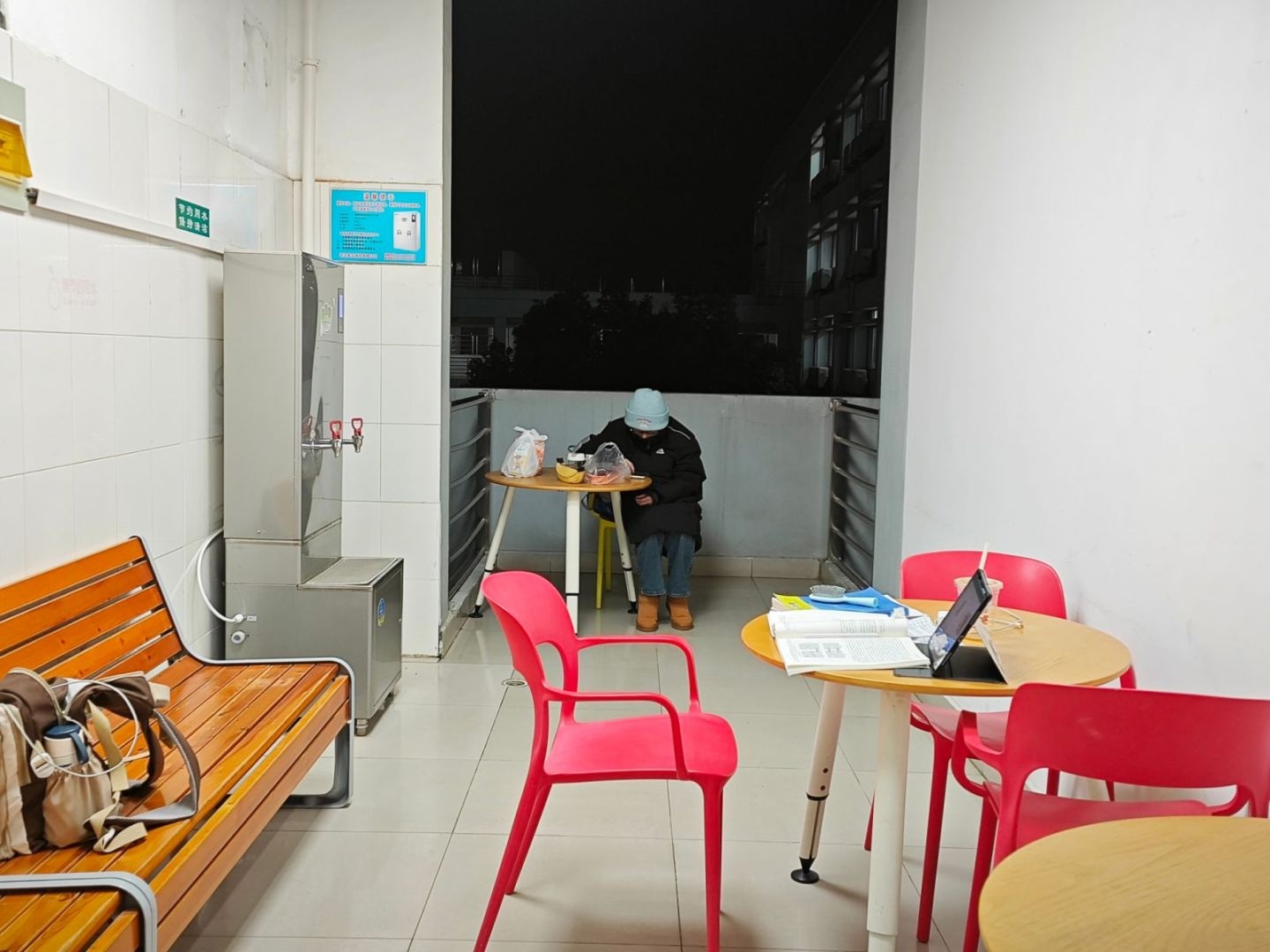 “露台处开阔些,晚上能看到星星和月亮,可以放松心情。学累了还能吃点水果和零食,给家人打个电话。在教室做这些的话会影响其他同学。”一位目前在备考研究生的同学称。