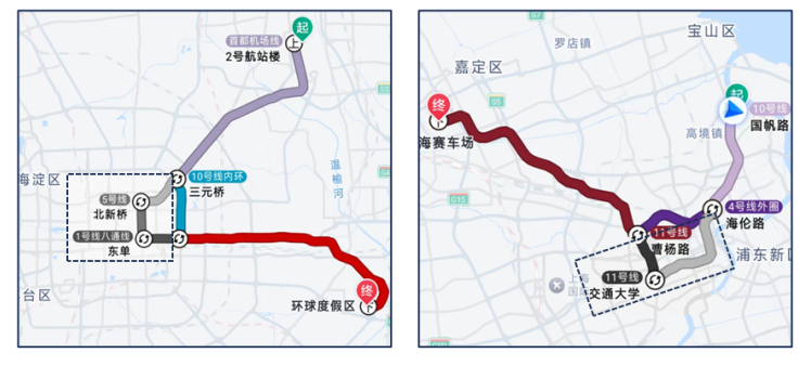 又例如,居住于复旦大学江湾校区的学生前往上海赛车场观看比赛时,可采取10号线、4号线、11号线的乘坐路径;若不搭乘环线,则将在10、11号线的交汇点交通大学站完成换乘。但有趣的是,由于上海地铁4号线成环偏小,又加之上海倾向于核心线路直接延长至远郊的布局方式,搭乘环线以增加1次换乘作为代价,却只得到了耗时减少3分钟的收益。