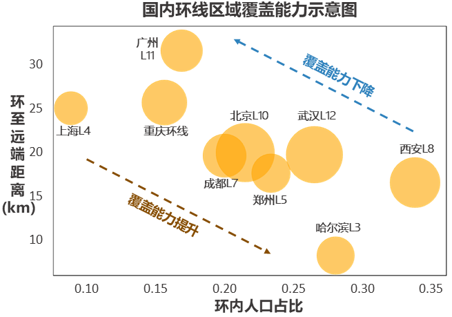 环至远端距离方面,大部分环线集中于15~20km,哈尔滨由于线网尚不成熟仅8.2km,广州因数条长距离的郊区新区线使得该项指标达到31.4km。环内人口占比和环至远端距离呈现出一定的相关性,成都、北京、郑州、武汉两项指标均在中位值左右且较为接近。