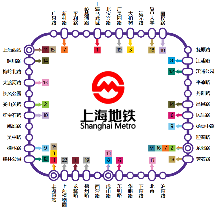 其全长52.4km,低于武汉地铁12号线和北京地铁10号线,与重庆、西安两环长度大致持平。由于承接的15、18号线在市区段设站较密,该环线站点个数较多而平均站间距较小,分别高于和低于均值28.6%、11.9%。得益于上海全国榜首的城区设站密度,该环线的换乘站比例仅次于原有的上海地铁4号线,60%以上的站点均为换乘站。