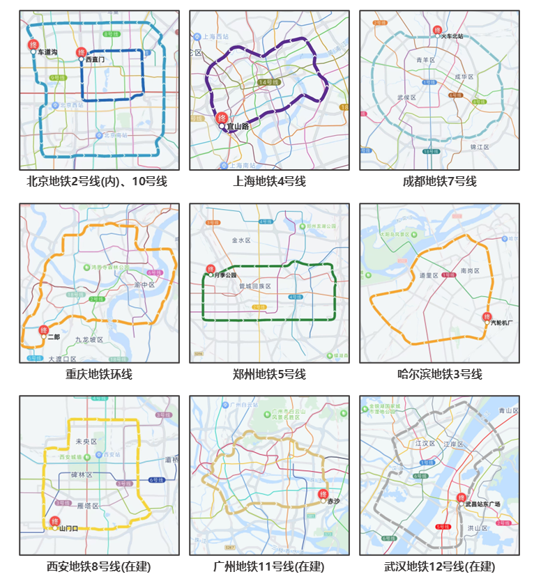 随着哈尔滨地铁3号线的成环,国内现已有北京地铁2、10号线、上海地铁4号线、成都地铁7号线、重庆地铁环线、郑州地铁5号线、哈尔滨地铁3号线六城七线。除此之外,还有西安地铁8号线、广州地铁11号线、武汉地铁12号线正在建设中,前两者也预计于今年底开通运营。