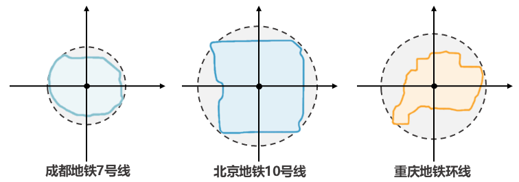 图7展示了3个典型的环线案例,其中北京地铁2、10号线均近似于正方形,通过计算等周长正方形和圆的面积关系可估算其“圆滑度”约为78.5%;成都地铁7号线在所有环线中和圆的近似程度最高,其“圆滑度”达到了91.0%;重庆地铁环线因强行串联各大核心商圈和铁路枢纽显得最为曲折,在形状上还有些神似广东省的版图,其“圆滑度”仅为56.5%。其他环线的数据列于表1中。