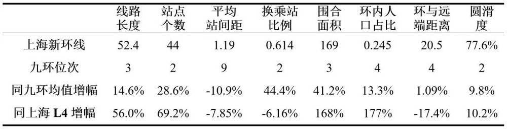 围合面积和环内人口占比方面,较上海地铁4号线均有超过一倍的提升,在已有九环中位居中上游。环与远端距离方面,较上海地铁4号线缩短了17.4%,但由于上海的线网规模较大、郊区线路延伸较长,故仍略高于九环均值。该环线的形状大致呈平行四边形且内角接近90度,因此“圆滑度”大致和呈正方形的北京地铁2号线、10号线相当。