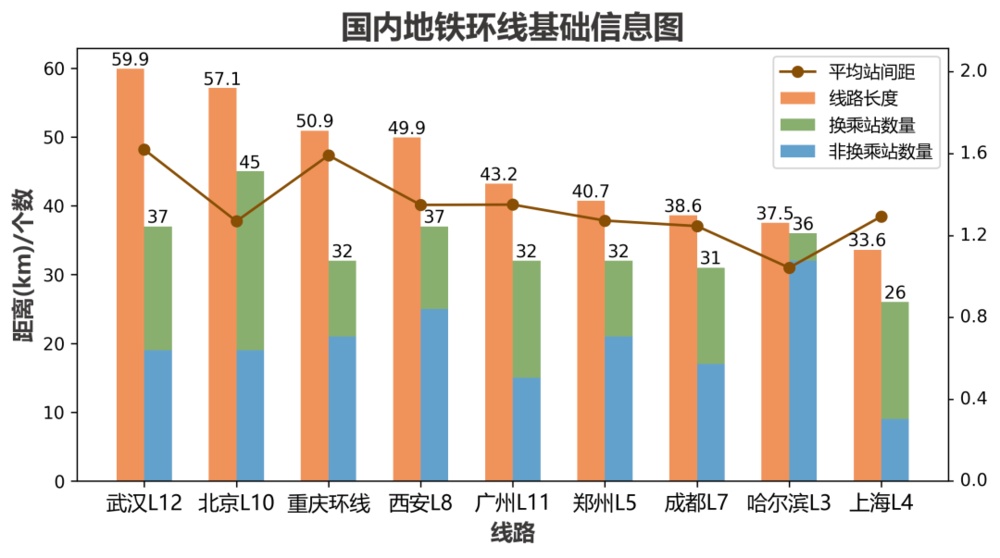 图4展示了国内地铁环线线路长度、站点数量、换乘站比例和平均站间距等基础信息[注1]。