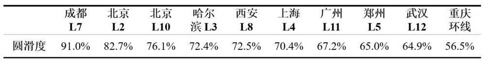 除上述较为严肃的统计信息,此处还提出了一个有趣的统计角度。“圆滑度”,本文将其定义为地铁环线的覆盖面积与同地铁环线里程相等的圆面积的比例,用于评价各地铁环线的曲折程度。