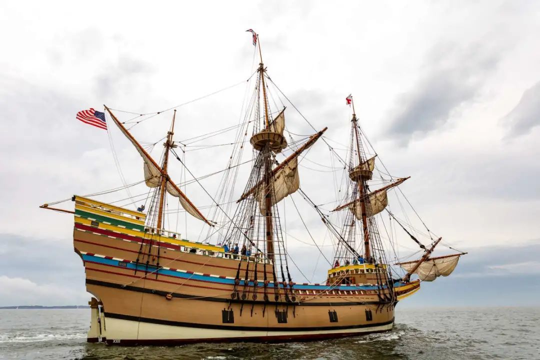 ▲载着第一批新教徒到达北美大陆的五月花号帆船