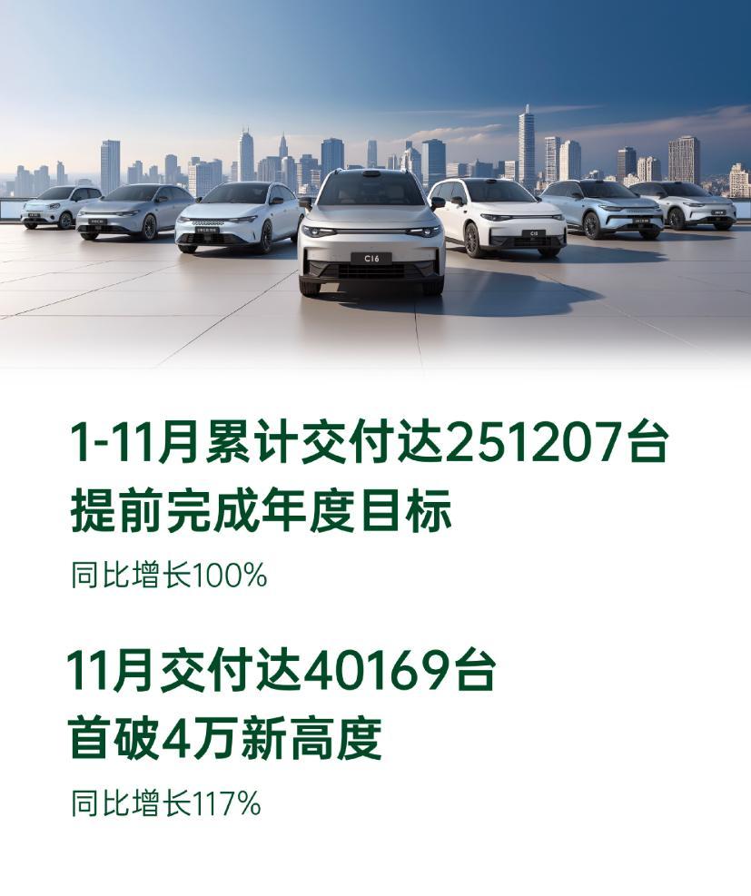已经多月高速增长的零跑在本月继续创下销量新高,11月,零跑汽车单月交付量首次突破4万台,达到40169台;1-11月,零跑汽车交付总量达到了251207台,成为首个提前完成全年销量目标的新能源汽车品牌。