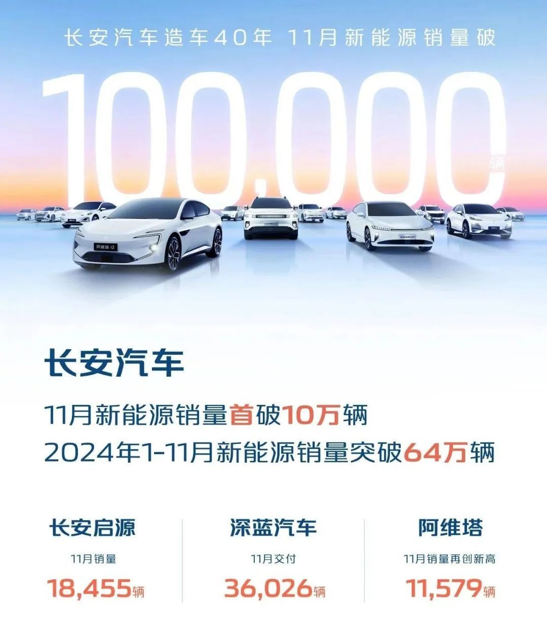 11月,长安旗下新能源销量首次突破10万辆,三大品牌深蓝、启源、和阿维塔实现先同环比双增长。