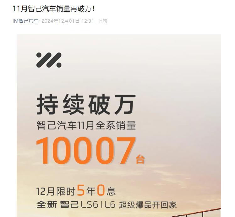 智己汽车11月全系销量10007台,与今年10月销量10001台基本持平。