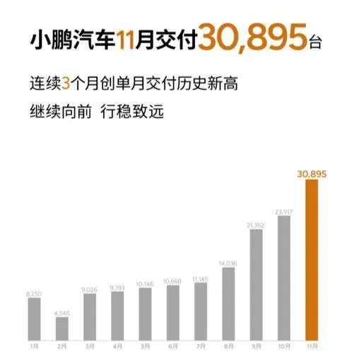 小鹏11月共交付新车30,895台,单月交付量首次突破3万台,连续3个月创单月交付历史新高。