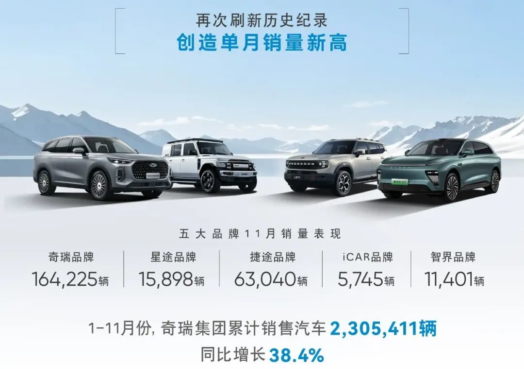 具体到品牌来看,奇瑞品牌11月销量164,225辆;星途品牌11月销量15,898辆;捷途品牌11月销量63,040辆;iCAR品牌11月份销量5,745辆。