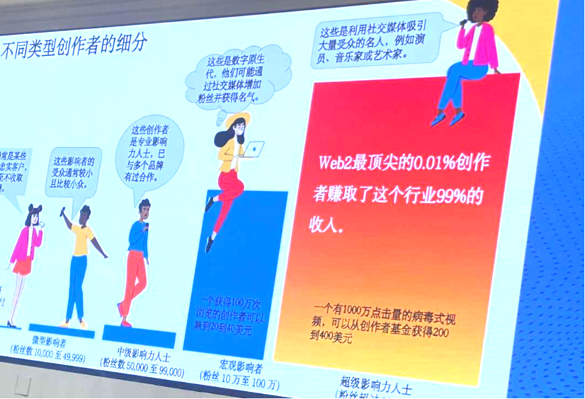 “Web2最顶尖的0.01%创作者赚取了这个行业99%的收入。”竑观投资管理合伙人、执行董事孙霄汉在演讲中提到,大部分内容创作者已经很难从Web2架构的内容创作中获得较为可观的收入。