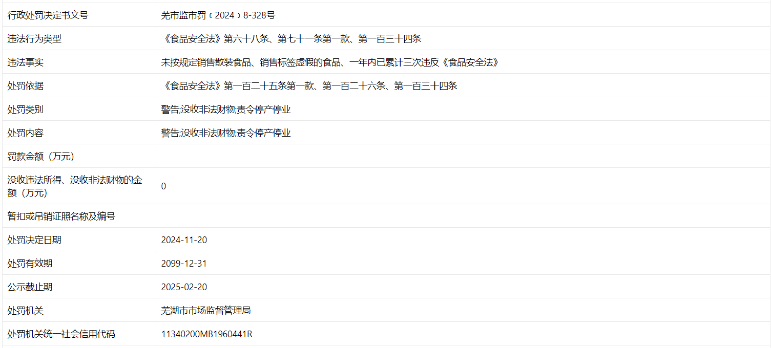 近日,信用芜湖披露行政处罚信息,因未按规定销售散装食品、销售标签虚假的食品,芜湖家佳来生活超市有限公司被警告,并没收非法财物、责令停产停业,该公司一年内已累计三次违反《食品安全法》。