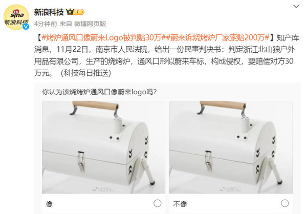 11月22日,南京市人民法院,给出一份民事判决书:判定浙江北山狼户外用品有限公司,生产的烧烤炉,通风口形似蔚来车标,构成侵权,要赔偿对方30万元。