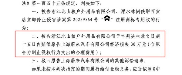 最终法院判定,北山狼公司侵权,要赔偿蔚来30万元。
