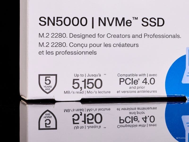 外包装的右下角则标注了这款固态硬盘的型号以及性能数据,其支持PCIe 4.0标准,顺序读取速度可达5150 MB/s,是目前中端PCIe 4.0固态硬盘的水准。