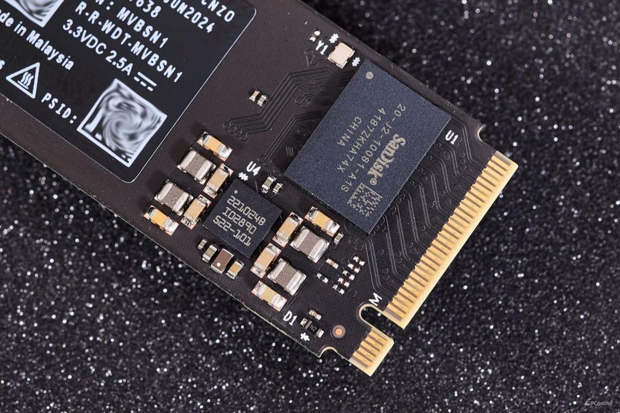 再来看看其硬件配置,拉进镜头可以看到,WD Blue SN5000的主控芯片为自研的闪迪第四代DRAM-Less SSD主控芯片,型号为 Sandisk 20-J2-10081-A1S,周围被多层陶瓷电容包围,以确保稳定的电源控制。规格上,其支持NVMe 1.4标准,并且采用了四通道设计,支持PCIe 4.0 x4接口,能够提供高达5150 MB/s的顺序读取速度和4850 MB/s的顺序写入速度。