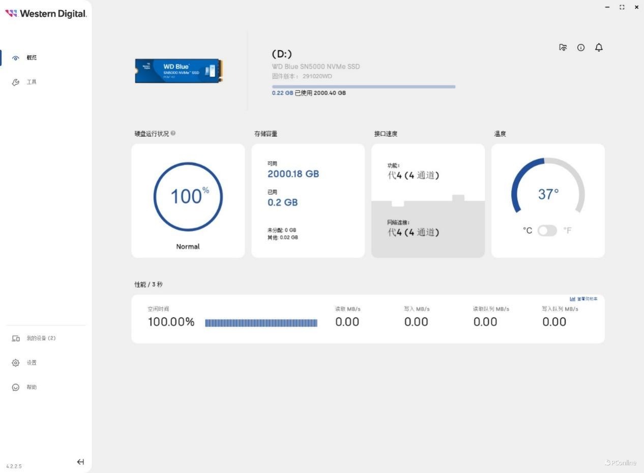 首先介绍一下Western Digital Dashboard,一打开节目就被简约的UI设计所吸引,首页非常鲜明的展示了目前硬盘的运行状态,像健康度、可用容量、温度甚至是性能都能在这里看到,非常方便。