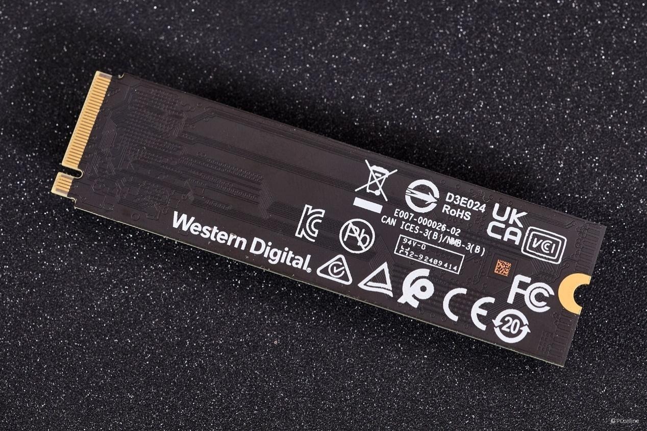 WD Blue SN5000 NVMe固态硬盘为2280长度规格,PCB为经典的黑色设计,硬件布局也与之前的WD Blue SN580基本相同,正面是NAND存储芯片、主控芯片以及周边电路设计,无外置缓存。