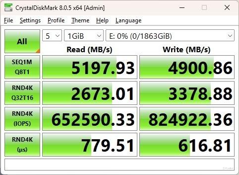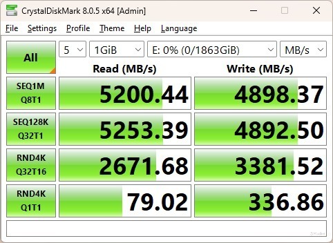 接着测试的是存储界的3DMark,在Crystal Disk Mark中对WD Blue SN5000固态硬盘进行实测,在1 GiB大小的数据量读写测试里,这款硬盘的最高连续读写速度分别为5200.44 MB/s和4898.37 MB/s,均超过5150 MB/s和4850 MB/s的标称值。