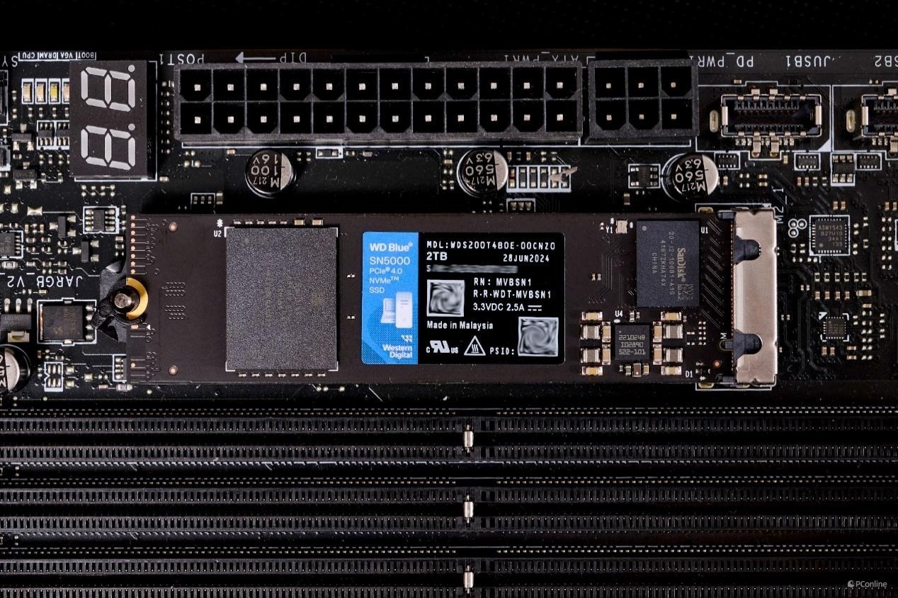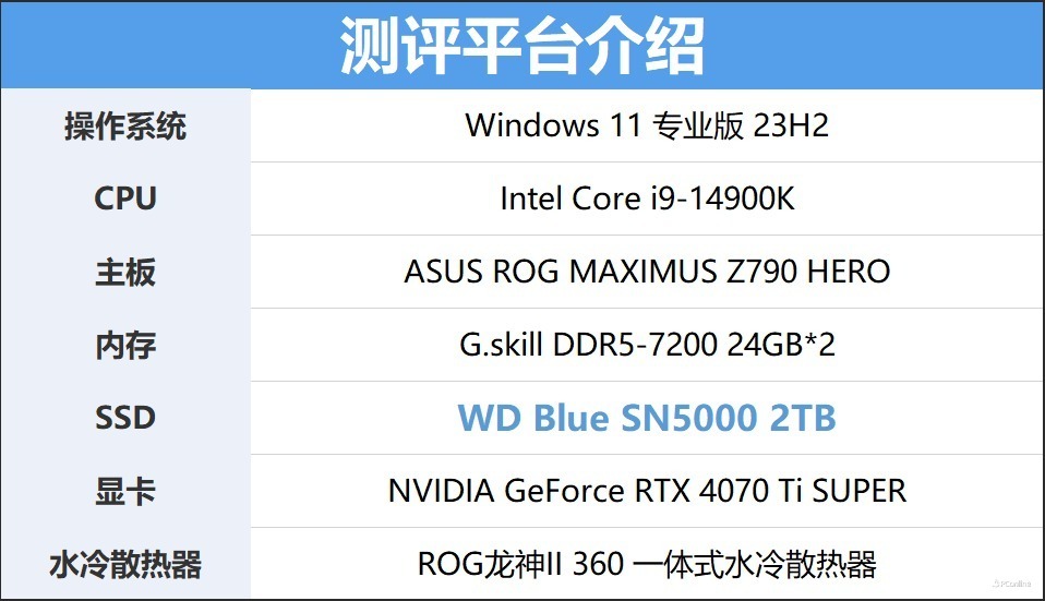 本次测试我们也是将评测室最顶级的主机搬来了,处理器是目前的性能天花板——Intel i9-14900K,搭配华硕ROG Z790 HERO主板,显卡则是普普通通的亮机卡RTX 4070 Ti SUPER,再搭配一套48GB的DDR5-7200MHz高频内存。想必这肯定能发挥出WD Blue SN5000的真实实力。