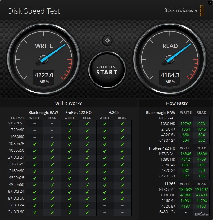 看完了游戏领域,再聊聊创作领域。我们用Disk Speed Test进行测试,实测WD Blue SN5000的写入速度为4222 MB/s,读取速度为4184.3 MB/s,对各种格式的文件兼容性也极好。大容量加上高性能,我想它就是专业用户的理想存储解决方案。