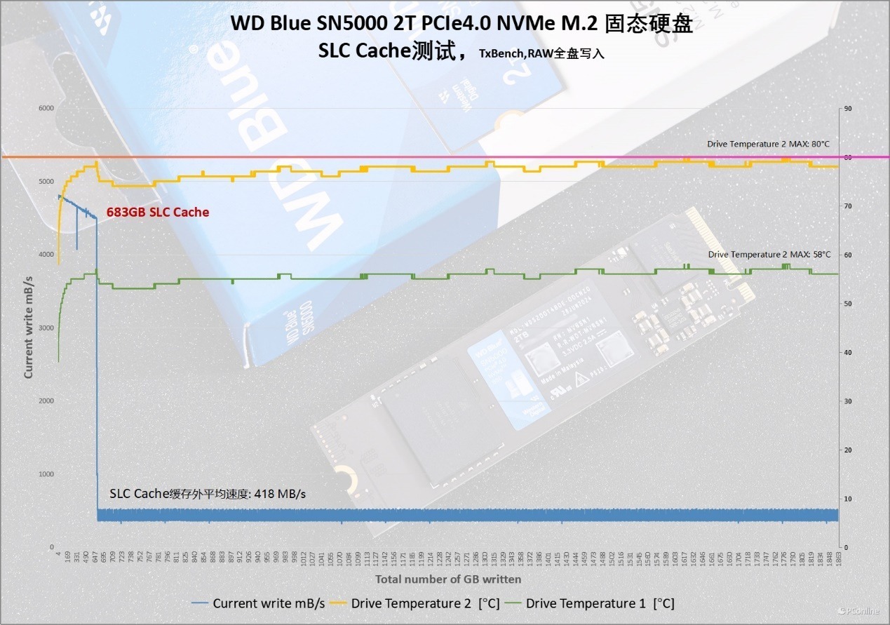 最后一项测试,我们用TxBENCH对WD Blue SN5000进行了全盘写入测试,从测试结果来看,这款固态硬盘拥有一个容量巨大的SLC 缓存,大约为683 GB左右。在顺序写入数据量达到该容量之前,SSD在很多时间里可以实现5500MB/s以上的顺序写入速度,而在超过这个容量后,SSD的顺序写入速度才会出现降速。不过,有一说一,应该没有多少用户能够一次性写入多达600 GB的数据,这样大容量的SLC缓存显然绰绰有余,足够使用了。