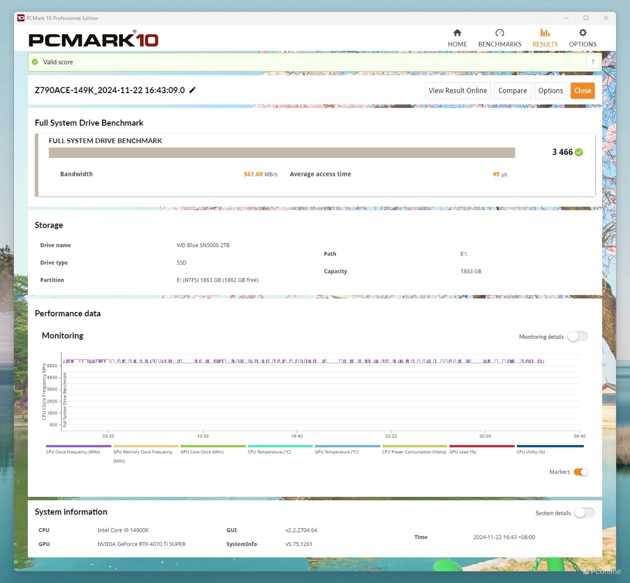 经过多轮测试,WD Blue SN5000得分3466,平均IO访问时间为 49 μs,带宽为 561.6 MB/s。超高的数据传输速度有效减少了处理大型文件、视频渲染和数据备份所需的时间,特别是在高负载情况下,WD Blue SN5000的性能表现依旧卓越,能够最大限度确保工作流程的高效率和流畅性,为用户提供了一流的体验。