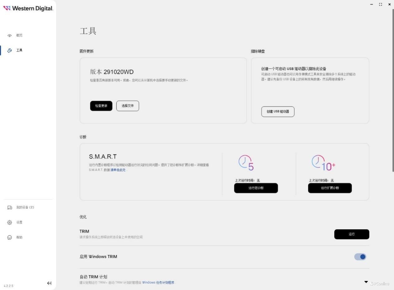 工具选项中能够操作的部分就更多了,像固件更新、擦除硬盘等功能一应俱全,除此之外还可以利用S.M.A.R.T.诊断硬盘的运行情况,启用TRIM等,定期给硬盘来个体检,硬盘的状态便一目了然。